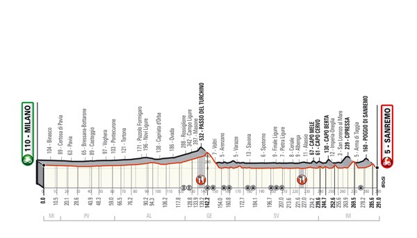 A 9 km dall’arrivo inizia la salita del Poggio di Sanremo (3,7 km a meno del 4% di pendenza media con punte dell’8% nel tratto che precede lo scollinamento). La salita presenta una carreggiata leggermente ristretta e quattro tornanti nei primi 2 km. La discesa è molto tecnica su strada asfaltata, ristretta in alcuni passaggi, con un susseguirsi di tornanti, di curve e controcurve fino all’immissione nella statale Aurelia. L’ultima parte della discesa si svolge nell’abitato di Sanremo. Ultimi 2 km su lunghi rettilinei cittadini. Da segnalare a 850 m dall’arrivo una curva a sinistra su rotatoria e ai 750 m dall’arrivo l’ultima curva che immette sul rettilineo finale di via Roma, tutto su fondo in asfalto.