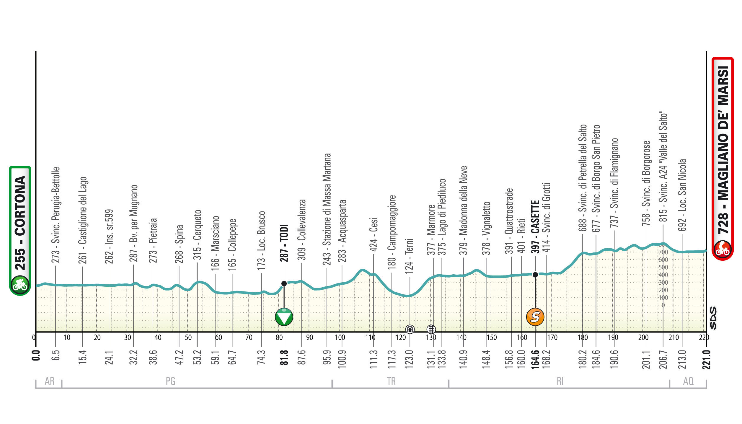 Si tratta di una tappa molto lunga e leggermente ondulata. Si snoda in un susseguirsi di lievi saliscendi, tra i quali si possono segnalare Todi e le Marmore. Finale veloce sempre leggermente a salire per gli ultimi 15 km fino al rettilineo finale (circa 3%).